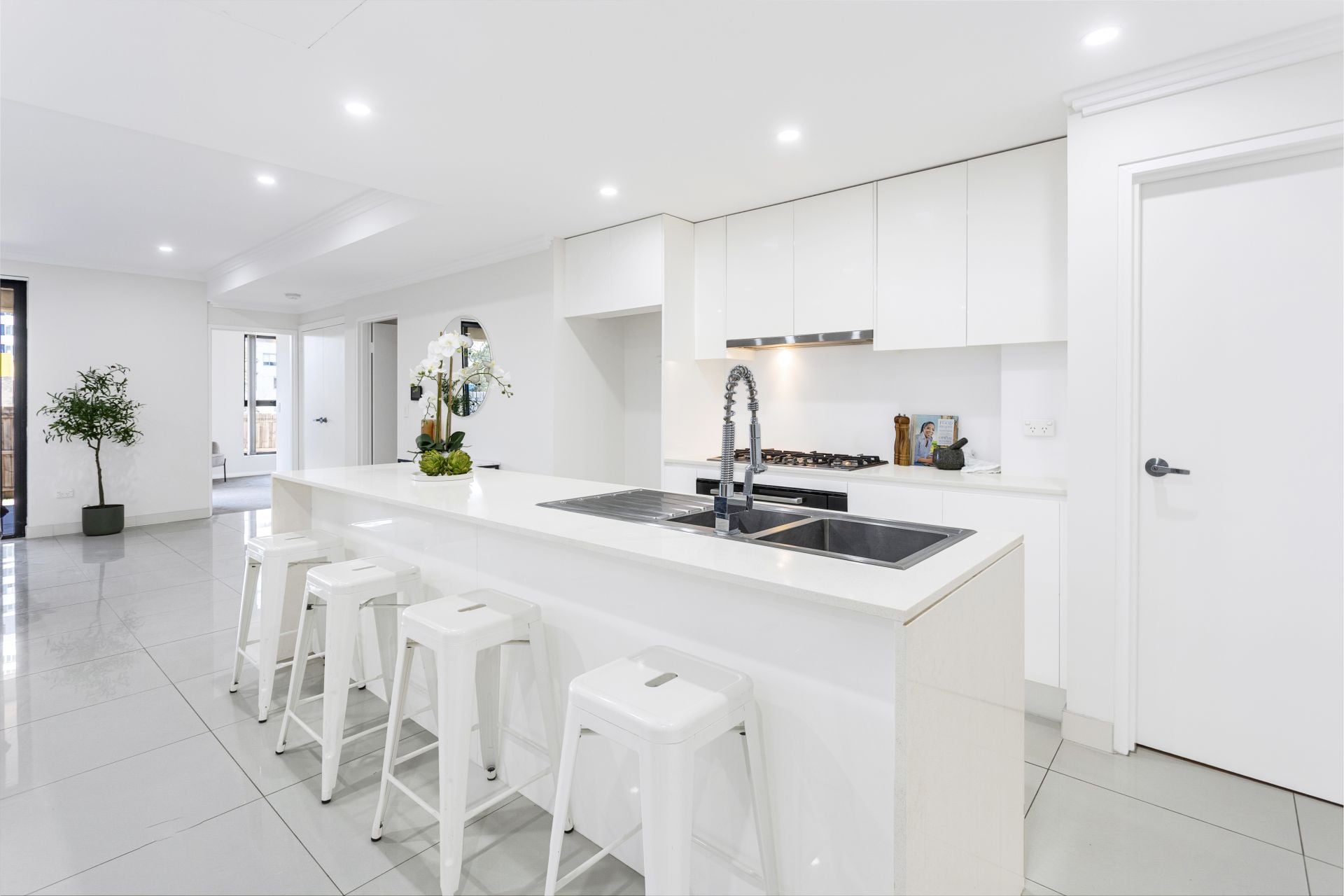 • Modern gourmet kitchen with gas cooking, dishwasher, double sink and ample storage